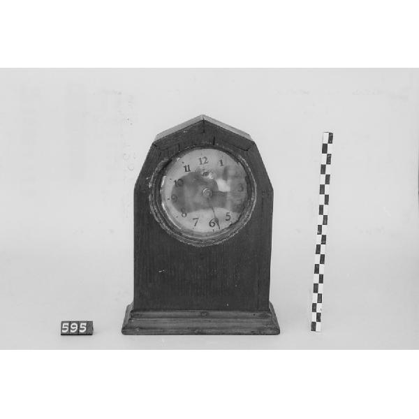 Orologio in latta smaltata rossa, dotato di suoneria e racchiuso in una scatola lignea con luce circolare anteriore e sportello posteriore