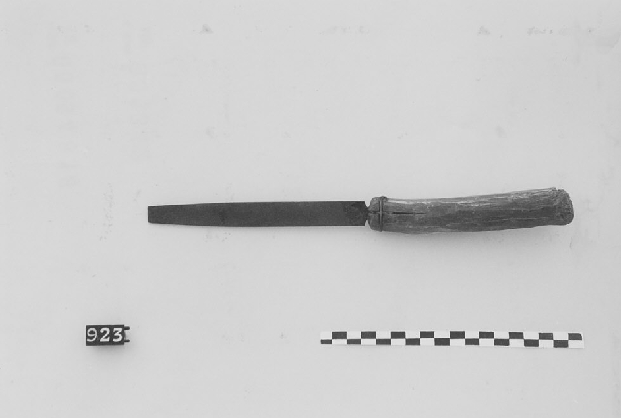 Sbarretta di acciaio rigata di solchi che si incrociano e munita di impugnatura lignea