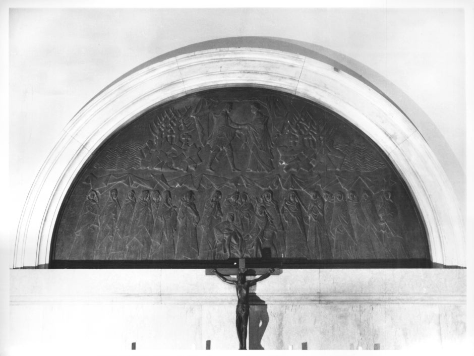 Lunetta a bassorilievo a due registri: in alto pa. Figure: soldati; figure femminili