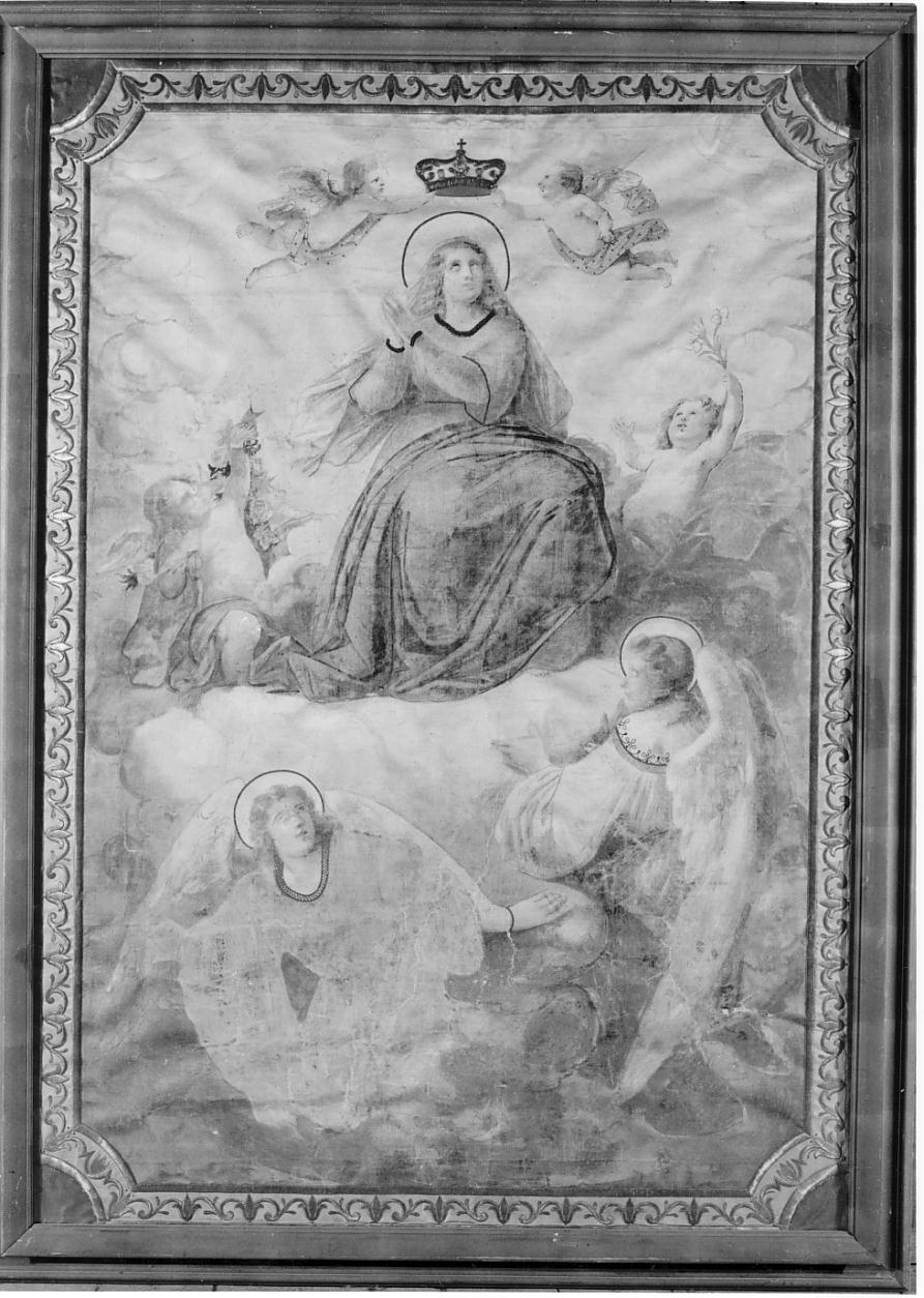 Figure: angeli; cherubini. Oggetti: ostensorio. Fenomeni naturali: nuvole. Personaggi: Madonna. Figure: angeli. Attributi: (Madonna) abiti; corona; aureola. Fenomeni naturali: nuvole