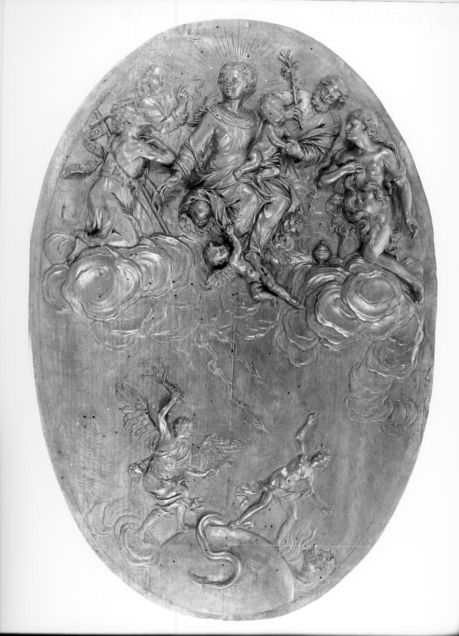 Personaggi: Madonna; San Giuseppe; Gesù Bambino; San Giovanni Battista; Santa Maria Maddalena; San Giovanni Evangelista; Arcangelo Jehudiel. Figure: angeli. Fenomeni naturali: nuvole. Attributi: (San Giovanni Battista) bastone; pelle di cammello; (San Giovanni Evangelista) calice; aspide; (San Giuseppe) ramo fiorito; (S. Maria Maddalena) capelli; vasetto di unguento; (Jehudiel) flagello; croce. Allegorie-simboli: figura femminile allegorica forse il male o il vizio; demonio che avvolge il mondo; Fenomeni naturali: nuvole; fiamme
