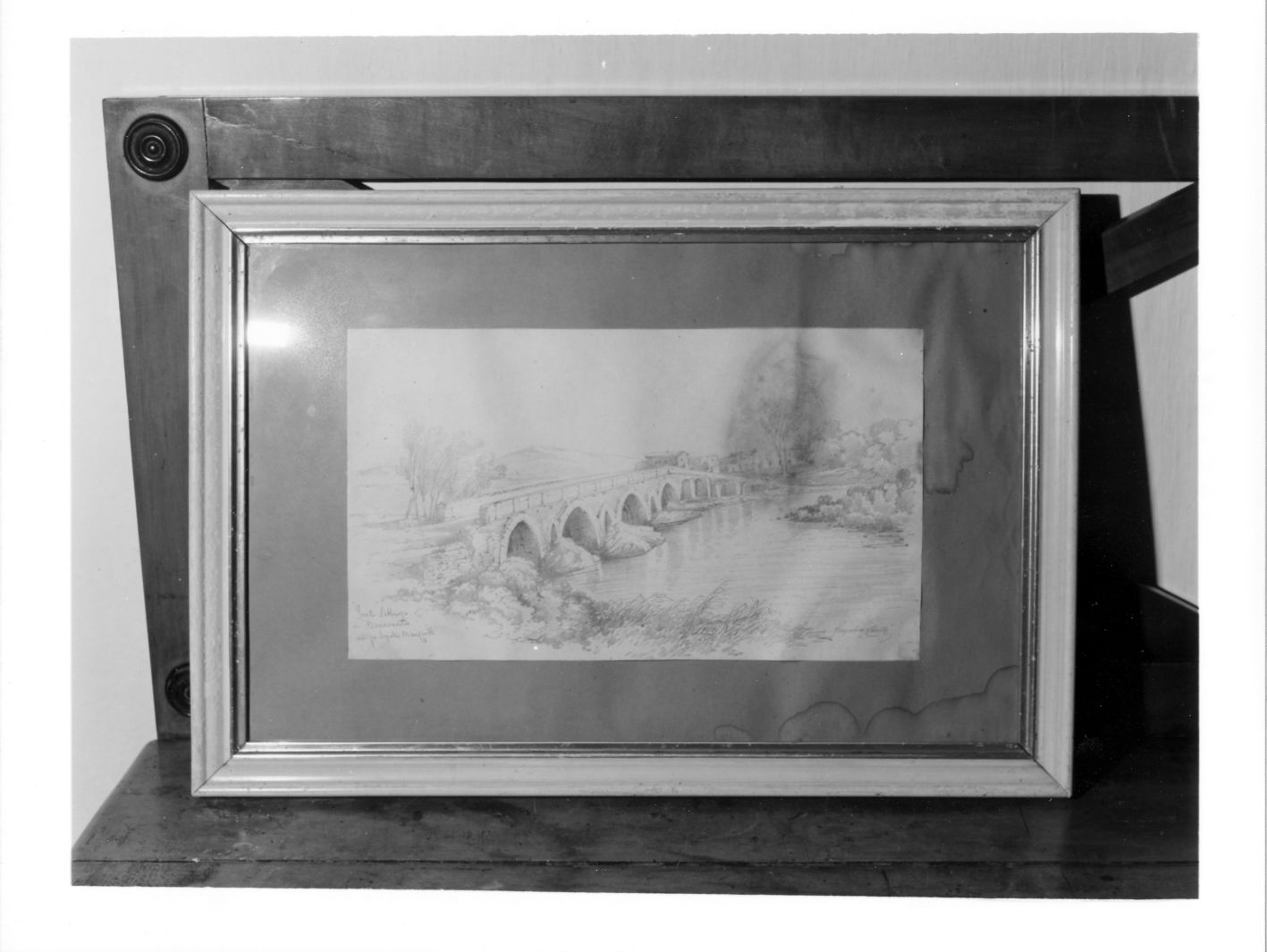 disegno raffigurante una Veduta di ponte Lebbroso a Benevento ove fu sepolto Manfredi. Paesaggi: paesaggio fluviale. Architetture: Banevento: Ponte Lebbroso