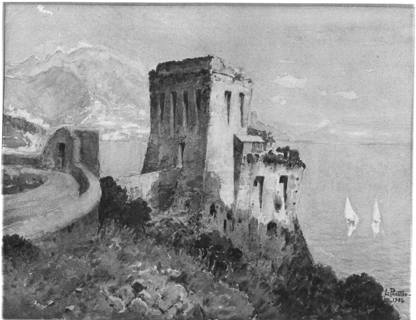 La scena già levitante per la leggerezza della tecnica con la quale è realizzata, acuisce la sensazione inquadrando come punto focale la torre dello Scarpariello vista nella sua posizione a picco sul mare. La scena è occupata in primo piano dallo spuntone di costa alla quale è arroccata. A destra sulla grande distesa di mare si intravedono due lontane imbarcazioni a vela mentre a sinistra c'è la descrizione della curva. Sul fondo si delinea la montagna degradante verso il mare. Colori chiari e luminosi. Provvisto di cornice.