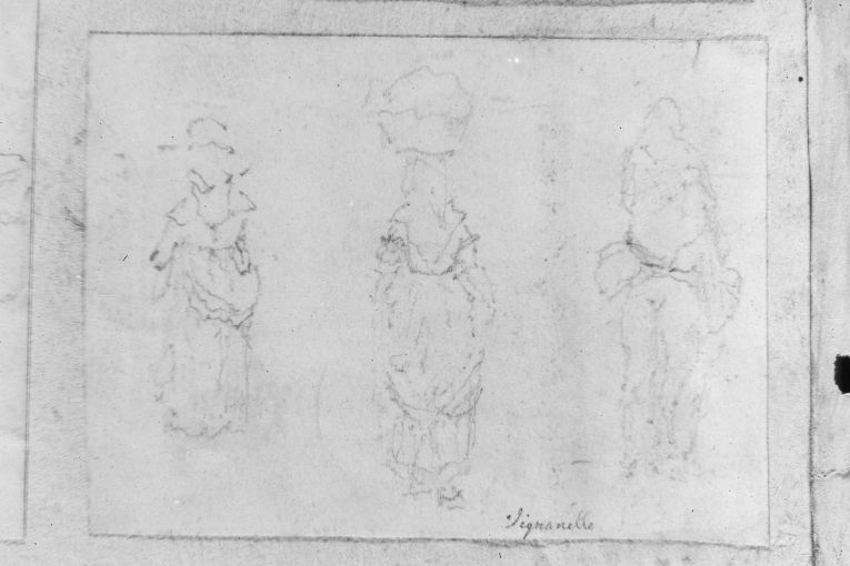 Figura femminile di spalle con fagotto di panni sulla testa// Figura femm inile di spalle con fagotto di panni sulla testa // Figura a cavallo di u n asino (disegno)