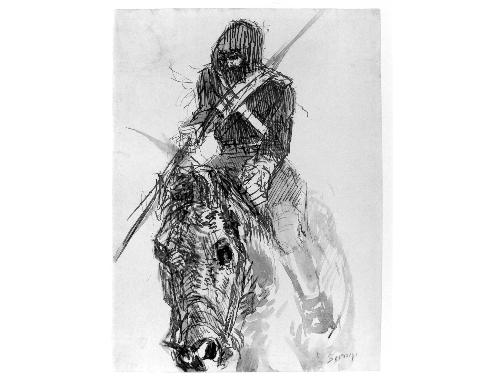 Disegno a penna e inchiostri acquerellati nero e rosso e matita azzurra su carta avorio.. Figure maschili. Animali: cavallo. Armi: lancia