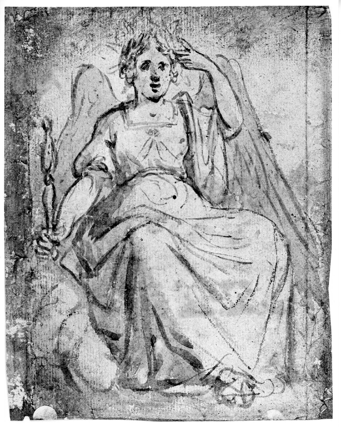 Disegno a acquerello bruno con lieve traccia a matita, controfondato, su carta beige, con una figura allegorica femminile che rappresenta forse la Regalità.