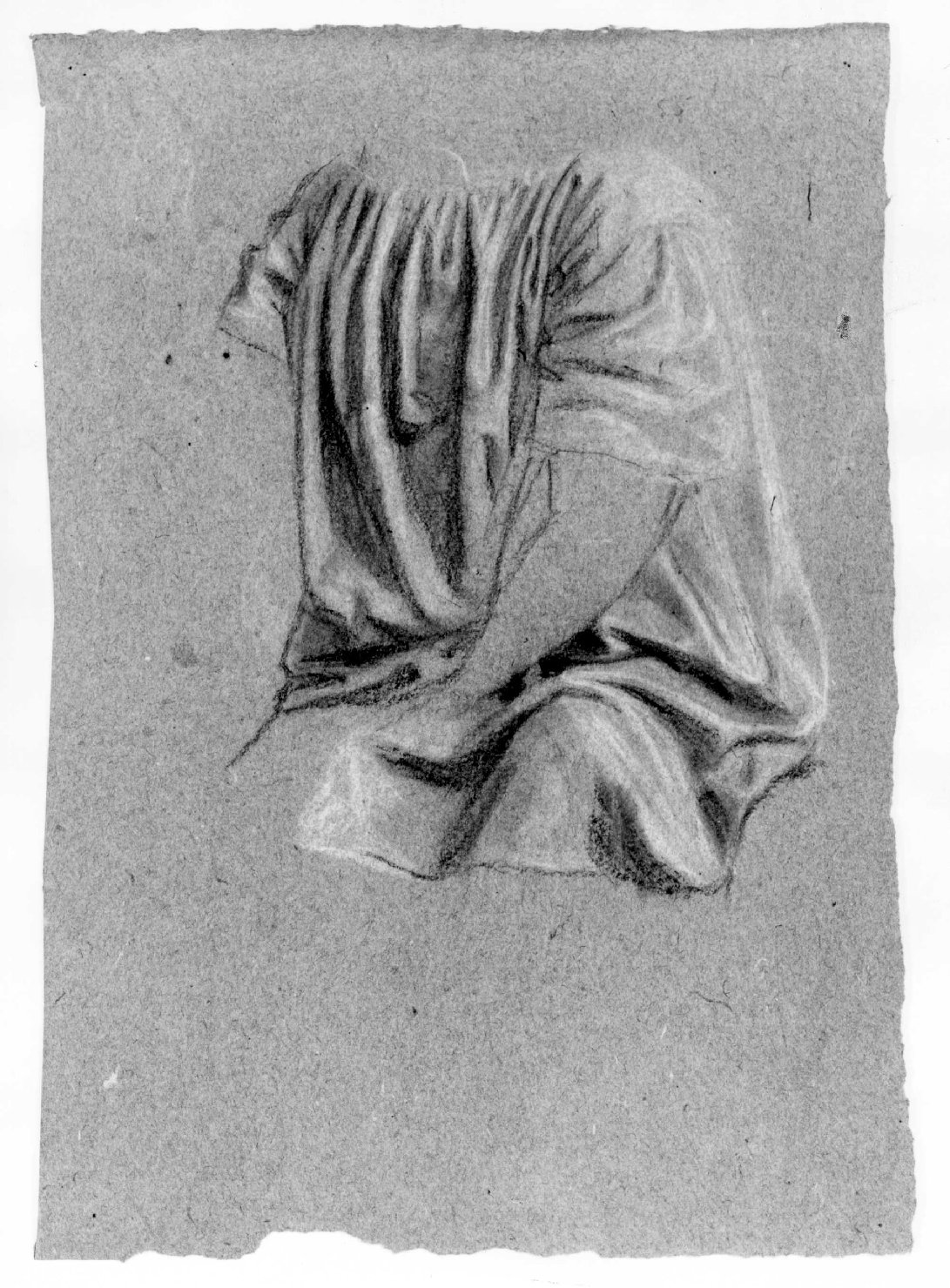 Disegno a carboncino, gesso bianco e nero su carta verde, con studio per panneggio.
