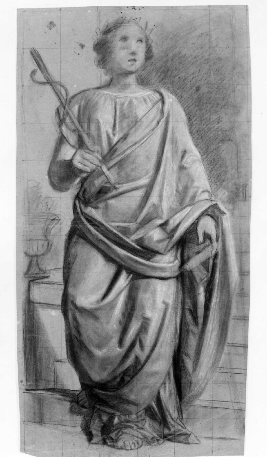 Disegno a carboncino, gesso nero e bianco, quadrettato a matita su carta nocciola, con uno studio per una figura allegorica, forse la Prudenza