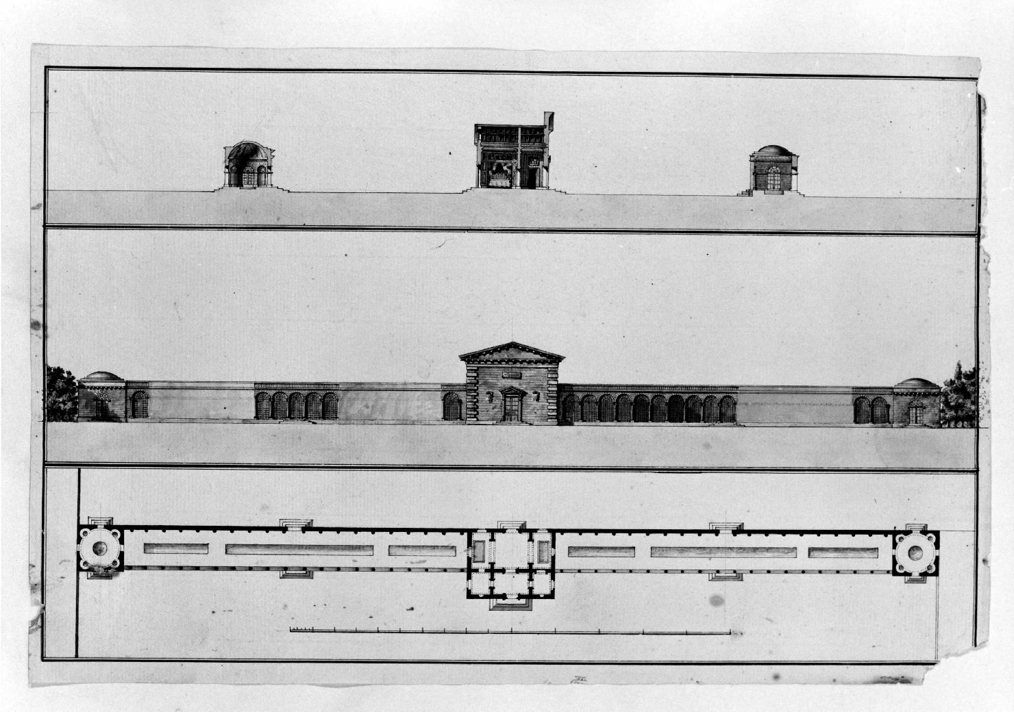 Disegno a penna, inchiostro nero, acquerelli grigio, verde, blu, rosa, giallo, incornciato a penna e inchiostro grigio, con sezione, prospetto e pianta di un edificio termale. La carta mostra una filigrana con decorazione a volute e le lettere G. F. A.