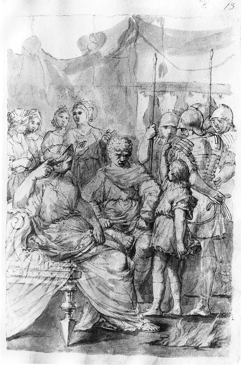 Figure: fanciulla; figure femminili; soldati; giovane uomo romano seduto; giovane donna romana seduta. Mobilia: poltrona. Interno. Abbigliamento: all'antica