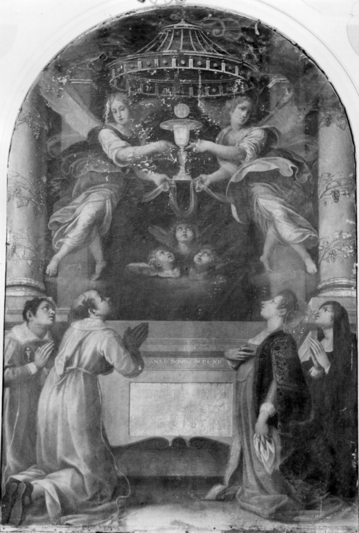 Figure: devoti; devote; angeli. Oggetti: calice con ostia