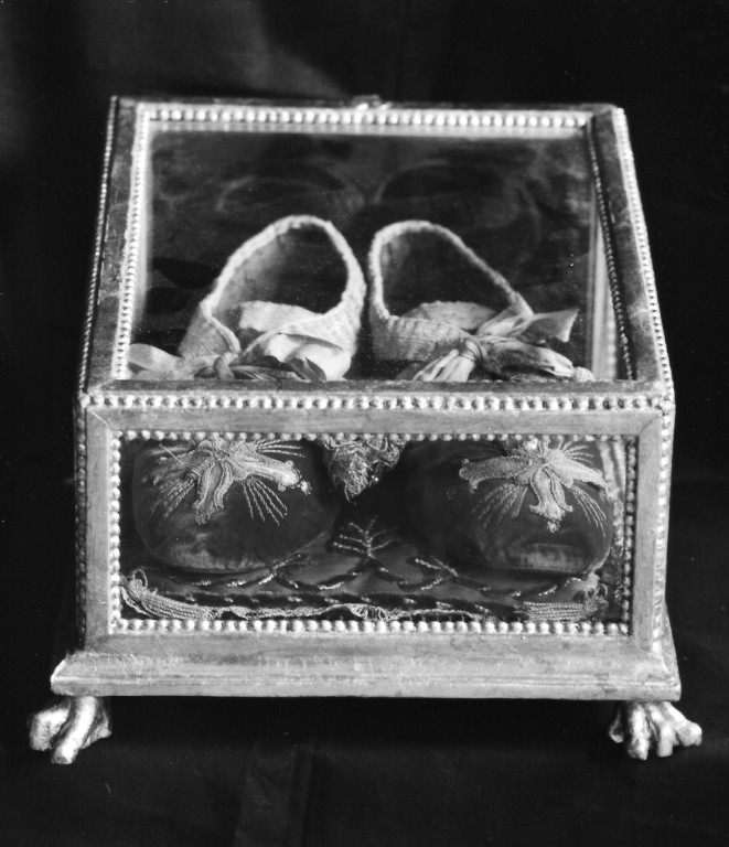 Pantofola decorata con una croce raggiata; allacciatura a fiocco con gallone e nappe dorate.