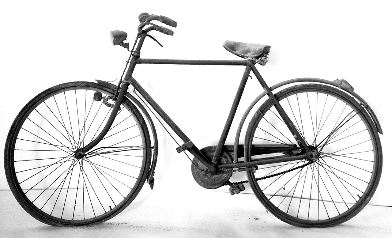 ferro; gomma; legno; cuoio, cm., altezza: 101.2; larghezza: 36; lunghezza: 136.5; varie: diam. ruota cm 63