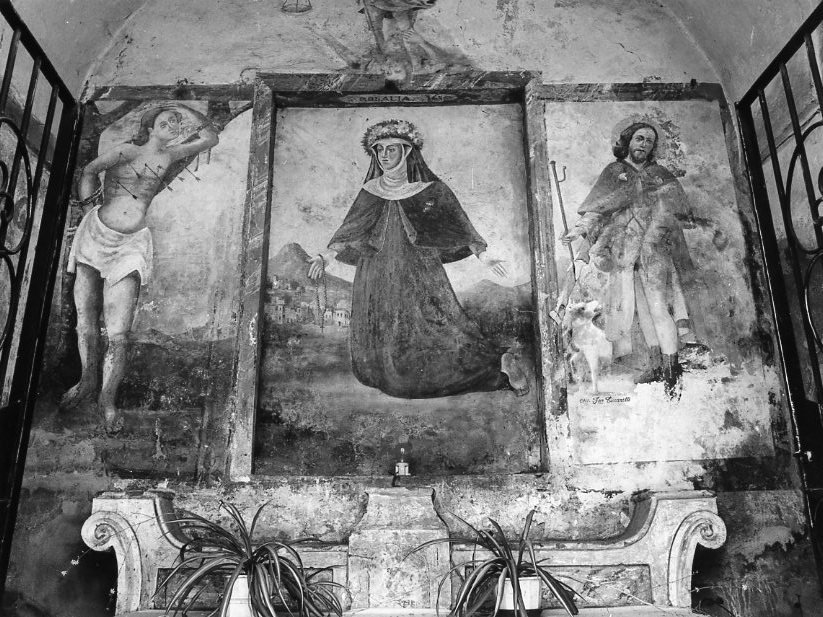 Il dipinto investe la parete di fondo della cappella dividendola in quattro parti: al centro figura Santa Rosalia inginocchiata, a sinistra San Sebastiano e a destra San Rocco, entrambi in piedi. Nella lunetta in alto, compare l'arcangelo Michele.. Personaggi: Santa Rosalia; San Rocco; San Sebastiano; Arcanagelo Michele