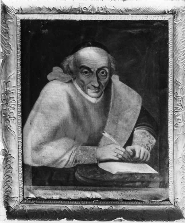 Il personaggio, Alessio Simmaco Mazzocchi , rappresentato con lo sguardo rivolto in avanti, e nell'atto di scrivere.