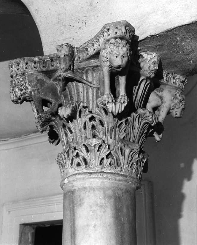 Il capitello consta di un doppio giro di foglie d'acanto, occupanti più della metà della superficie, di una serie di strigliature che percorrono la parte superiore, di 4 leoni, scolpiti negli angoli.