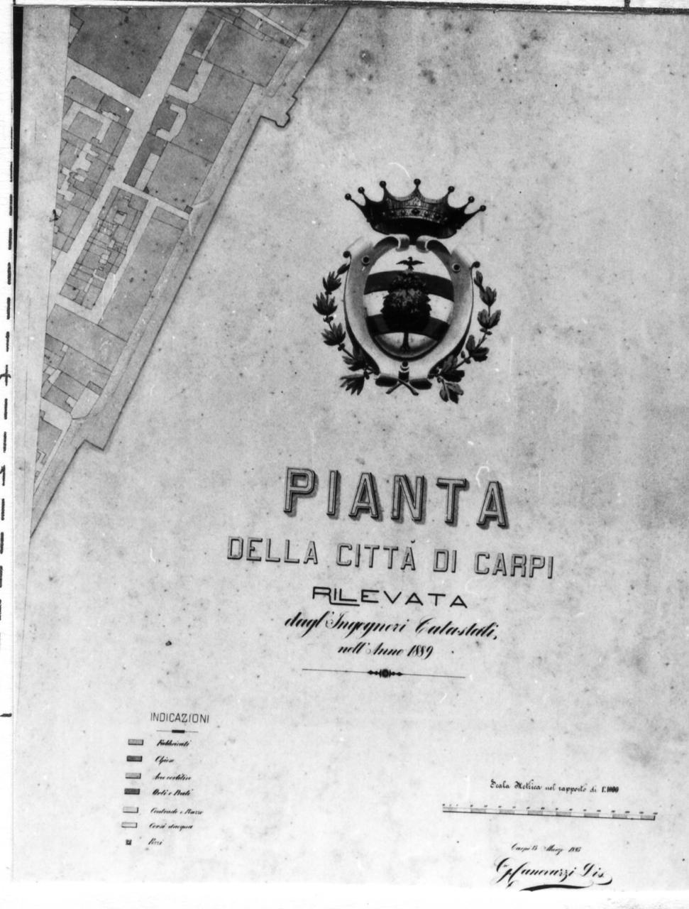 Disegno a penna, acquerello su cartone con la raffigurazione topografica della pianta della città nei suoi isolati e il circuito delle mura, nelle tonalità rosa, verde e grigie, eseguita su quattro cartoni oltre uno di dedica che contiene lo stemma cittadino. Carte geografiche: pianta di Carpi