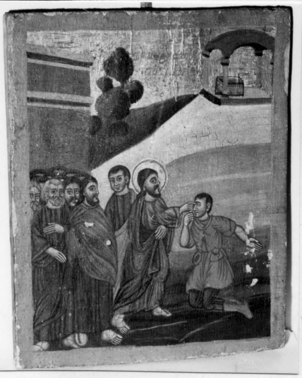 Cristo attorniato dagli Apostoli guarisce un uomo cieco inginocchiato davanti a lui. I colori sono brillanti sui toni rossi con sfumature. Fondo a paesaggio ed architetture e cielo dorato a lamina. Listatura nei bordi di color rosso.. Personaggi: Cristo; Apostoli. Figure: uomo. Paesaggi. Architetture