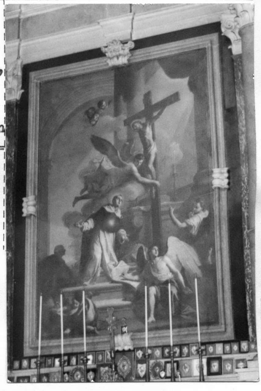 Il Santo, in saio domenicano, inginocchiato ai gradini di un altare, contempla il crocifisso retto da un angelo. A destra, altri due angeli, uno dei quali scrive su di un libro "bene scripsisti Thomas"; altri due angioletti a terra, mentre testine alate in cielo assistono all'evento.. Personaggi: San Tommaso; Cristo. Figure: angioletti. Oggetti: libro; altare