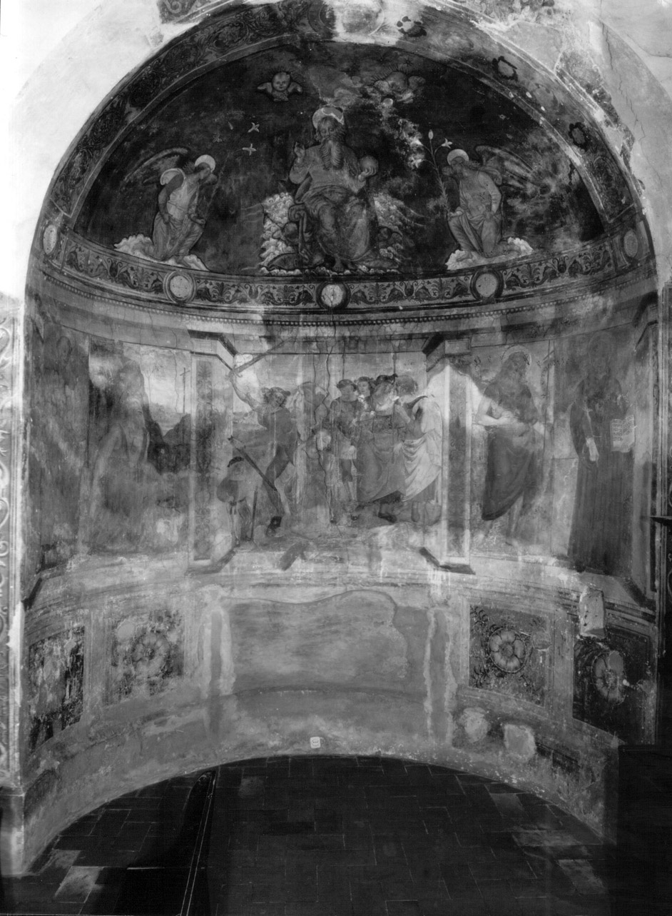 Nel semicatino l'Eterno in gloria benedicente tra angeli e cherubini.- Nel la parete al centro S. Caterina, inginocchiata sta per essere martirizzata dal carnefice alle sue spalle; sulla destra degli astanti. Ai lati a sini stra S. Antonio da Padova e S. Girolamo inginocchiato davanti alla caverna ; a destra i SS. Giovanni Battista e Nicola da Tolentino, tutti raffigurat i secondo l'iconografia tradizionale.. Soggetti sacri: Dio Padre in gloria e Santi. Personaggi: Dio Padre; Santa Caterina; Sant'Antonio da Padova; San Girolamo; San Giovanni Battista; San Nicola da Tolentino. Figure: Angeli; Cherubini. Attributi: (San Nicola da Tolentino) Sole; Gigli. Attributi: (San Giovanni Battista) Agnus Dei; Car tiglio. Attributi: (Sant'Antonio da Padova) Cuore. Attributi: (San Girolam o) Crocifisso. Oggetti: Berretta. Strumenti del martirio: Spada. Figure maschili: Soldati. Figure femminili. Abbigliamento