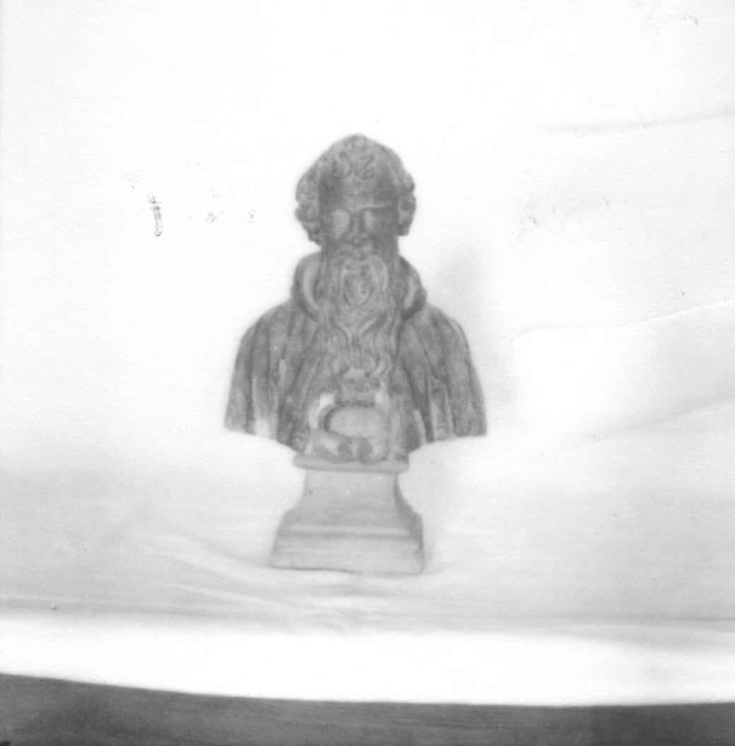 Il santo, con lunga e folta barba, indossa un abito con cappuccio. Teca vuota per le reliquie sul suo petto.