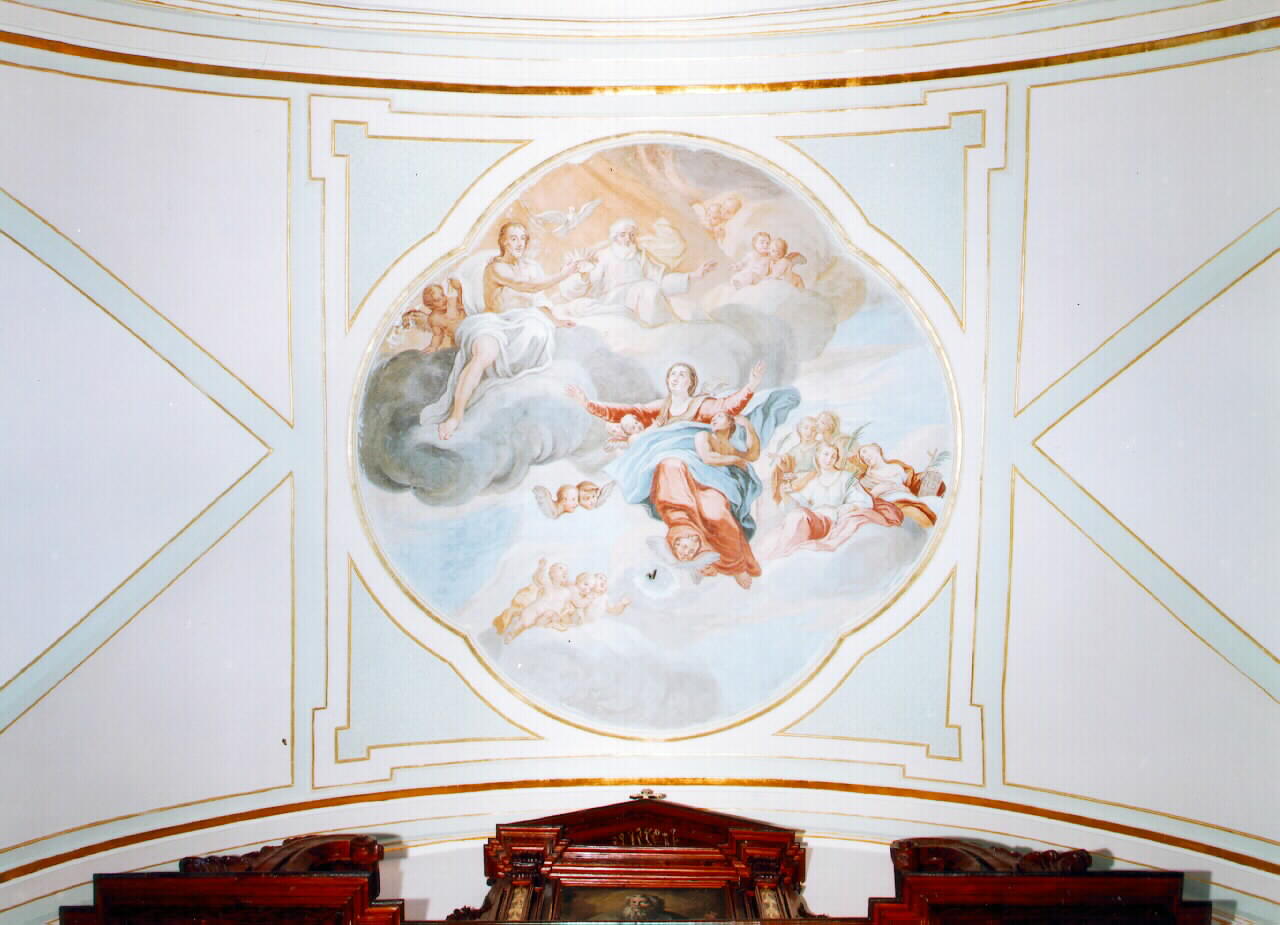 Personaggi: Madonna; Cristo; Dio Padre; S. Lucia; S. Agata; S. Barbara. Attributi: (S. Lucia) piatto con occhi. Attributi: (S. Barbara) torre. Figure: santa martire; angioletti; cherubini; puttini. Simboli: colomba. Simboli del martirio: palma. Oggetti: corona; crocifisso; tavola