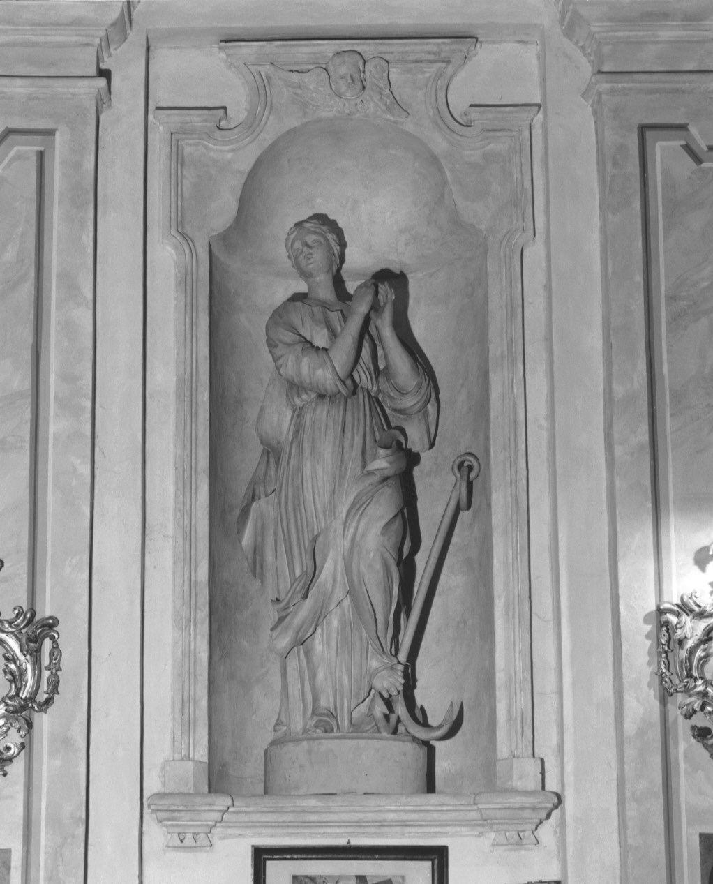 Le tre statue presentano, su piedistalli a base circolare, le Virtù teologali nel seguente ordine: la Speranza (parete sinistra), la Fede (parete sinistra), la Carità (parete destra). La Speranza è effigiata a mani giunte, in atteggiamento estatico, con lo sguardo rivolto al cielo; ai suoi piedi è raffigurata l'ancora, antico simbolo cristiano della speranza nella beatitudine celeste, la cui forma a croce allude alla Passione di Cristo. La Fede, ammantata e con il capo velato, innalza con la destra il calice con l'Eucarestia e sorregge con la sinistra la croce della Passione, immagini collegate da un'ampio significato simbolico alludente appunto alla fede cristiana, in quanto l'uomo riceve da Dio il suo destino, come un calice riceve la benedizione (Salmi 10,6); e Cristo ha parlato del destino della passione a lui riservato come di un calice (Matteo 20, 22). La Carità, a seno nudo, sorregge con la sinistra un neonato e tiene per mano con la destra un fanciullo.. Personificazioni: Speranza; Fede; Carità. Attributi: (Speranza) ancora. Attributi: (Fede) calice; croce. Attributi: (Carità) putti