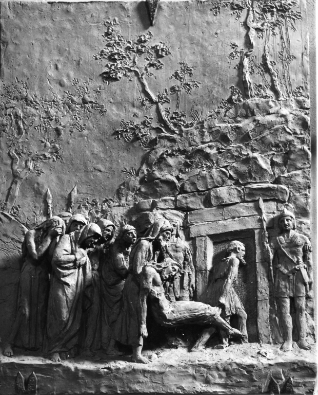 stazione XIV: Gesù deposto nel sepolcro (formella)