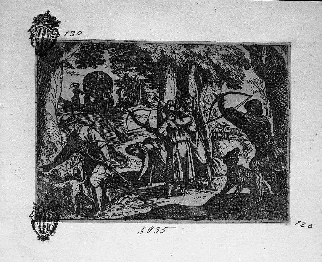 Caccia agli uccelli con la balestra, caccia (stampa smarginata)