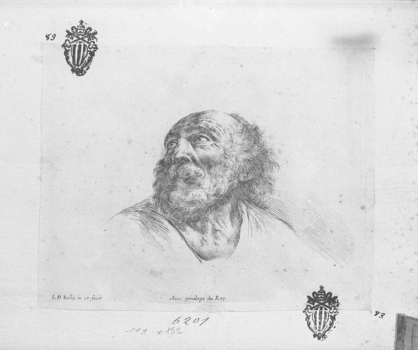 I principi del disegno: testa di vecchio con gli occhi rivolti al cielo, figura maschile (stampa tagliata)