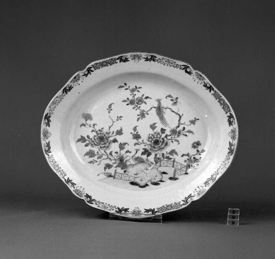 Vassoio apodo con ampio cavo, tesa sagomata e obliqua. Giardino fiorito con peonie, uccelli e staccionata; sulla tesa fascia con foglie e fiori alternati a perle rotonde, a gruppi di tre, e romboidali a gruppi di due. Colori: rosso, arancio, verde (in due toni), bianco, giallo, marrone e oro su fondo azzurrato.
