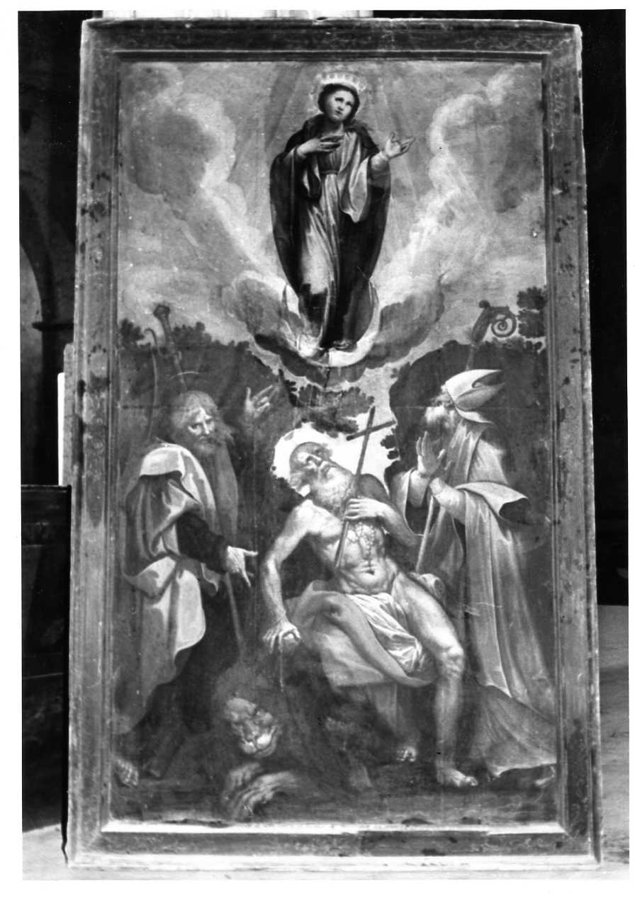 Tre Santi in adorazione difronte l'apparizione della Madonna.. Personaggi: Madonna; Santi. Paesaggi: naturalistico