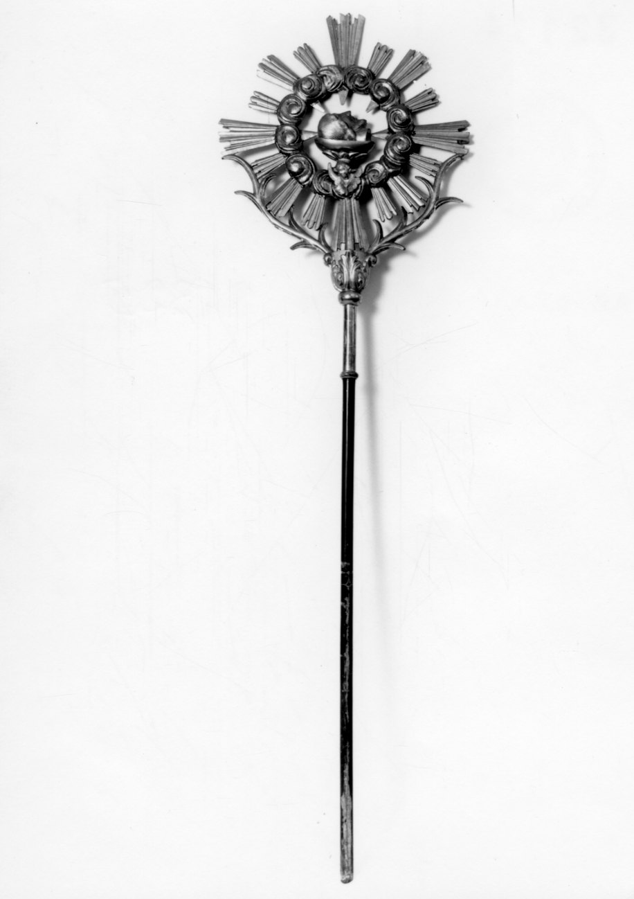 Asta tornita dipinta in nero. Nodo globulare con collarino liscio; nodo a bocciolo floreale da cui si originano due tralci su cui poggia il terminale. Terminale intagliato con raggiera a fasci dorati che hanno origine da una corona circolare di nubi argentate. Al centro, un cherubino e la testa di San Giovanni Battista su un vassoio.. Soggetti sacri. Personaggi: San Giovanni Battista