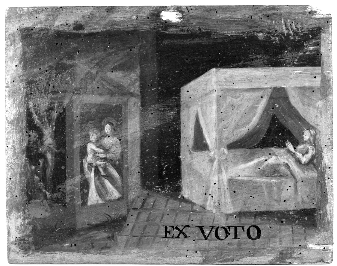 Una devota malata, distesa sopra ad un ampio letto a baldacchino, rivolge a mani giunte una preghiera di guarigione ae immagini sacre dipinte sulla parete antistante: una crocifissione e una Madonna co Bambino.. Personaggi: Madonna. Figure: figure maschili. Abbigliamento. Mezzi di trasporto: carro. Paesaggi