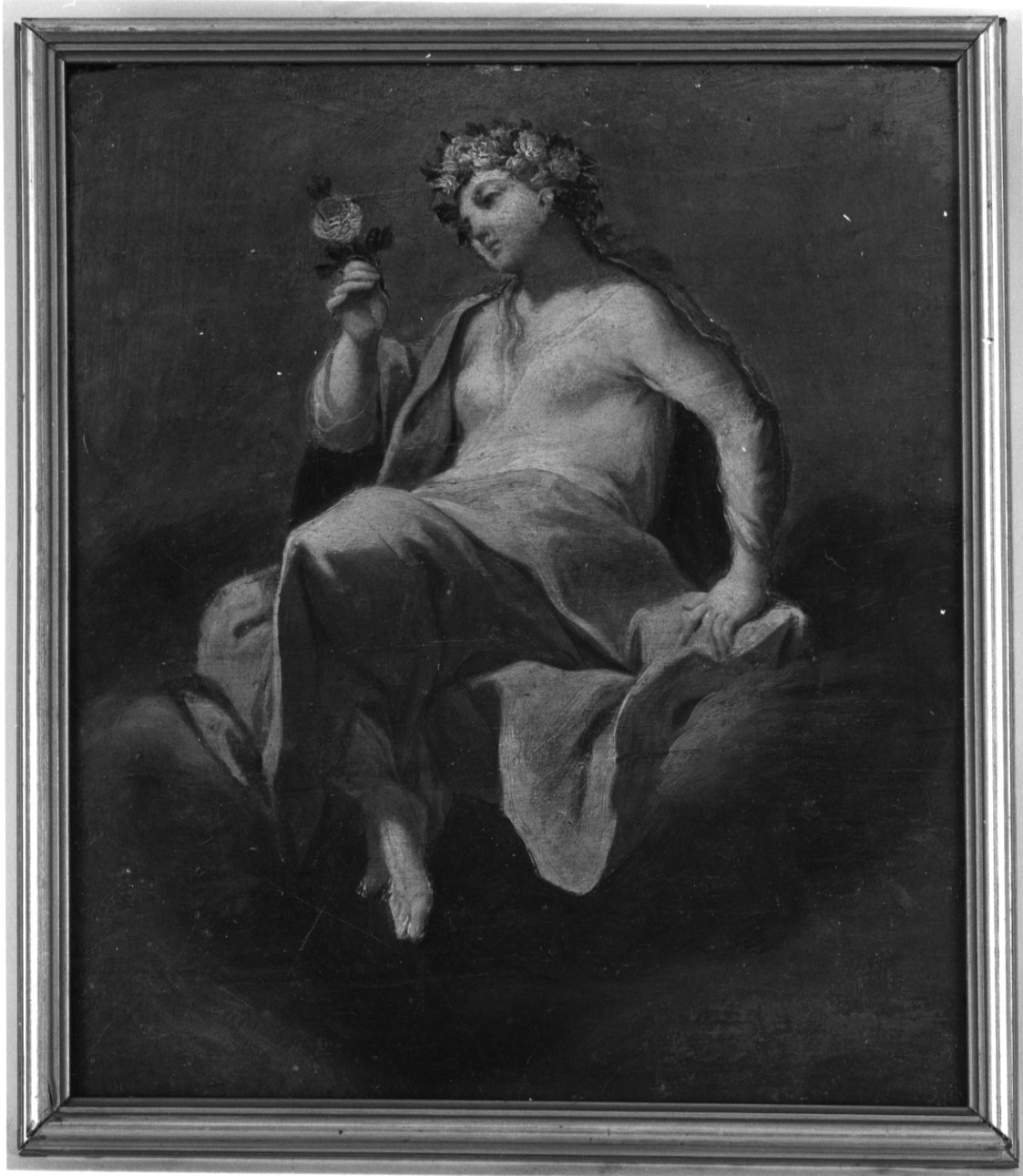 Tavoletta con palchettatura rifatta sul retro, con semplice cornice lignea moderna. E' raffigurata una figura femminile, identificabile forse con Flora: ha una corona di fiori nei capelli e un fiore nella mano destra; siede su delle nuvole e indossa un manto azzurro.. Allegorie-simboli: Flora. Abbigliamento. Piante: fiori. Fenomeni naturali: nuvole