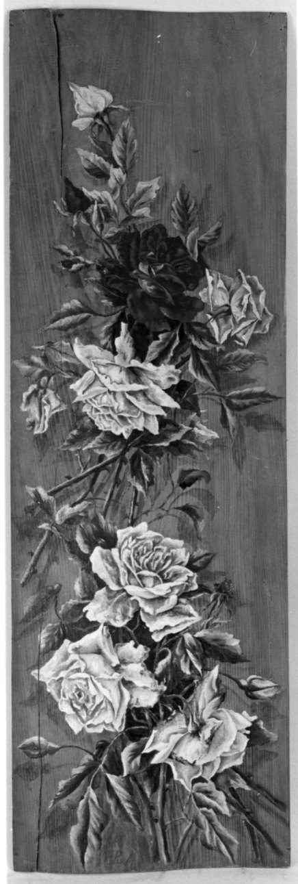 Sottile tavoletta, senza preparazione, che presenta sul retro schizzi di rose a matita. Sono dipinti due mazzi di rose rosse, gialle e rosa.. Piante: fiori: rose