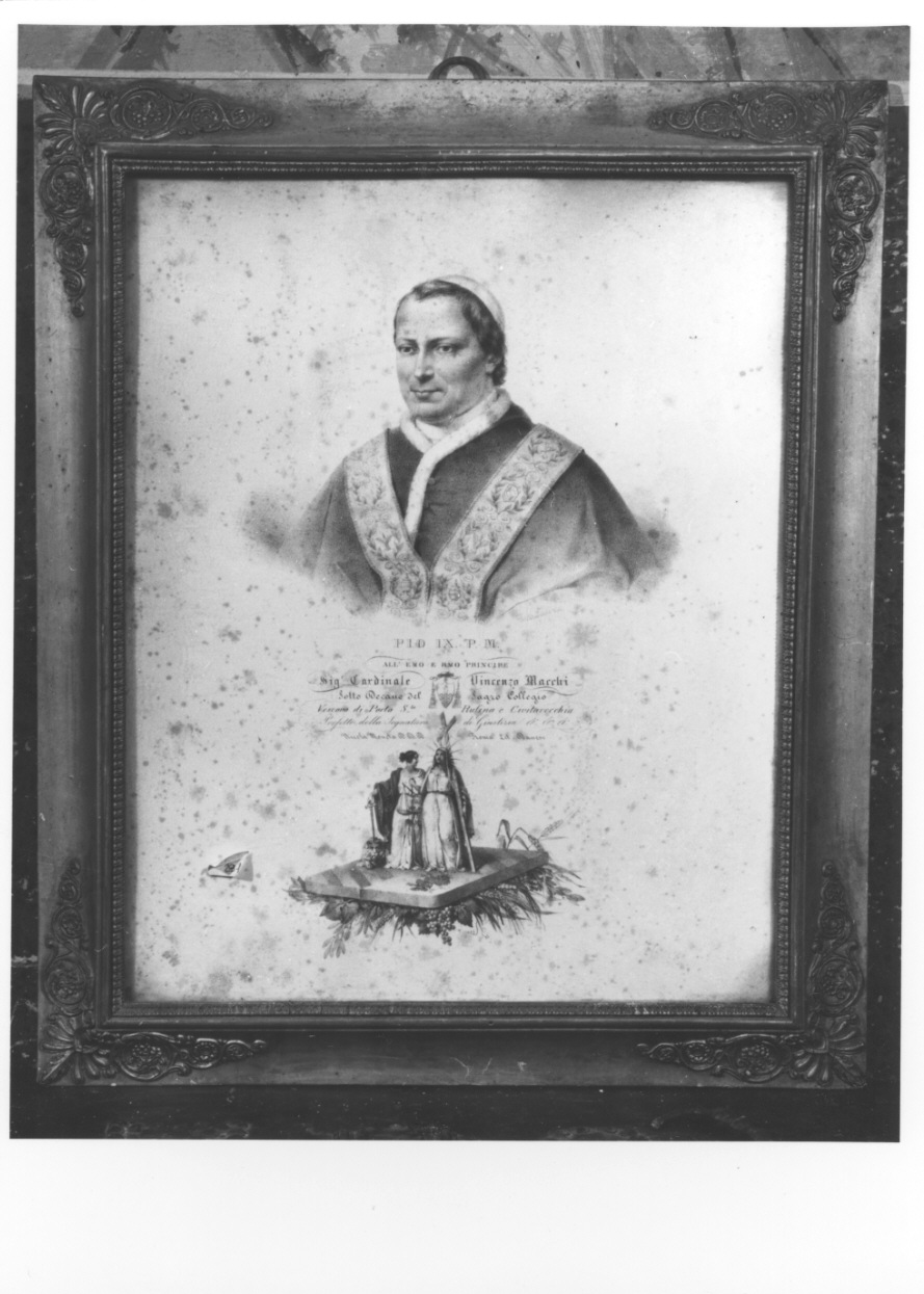 ritratto a mezzo busto di papa Pio IX con le allegorie della Giustizia e della Fede