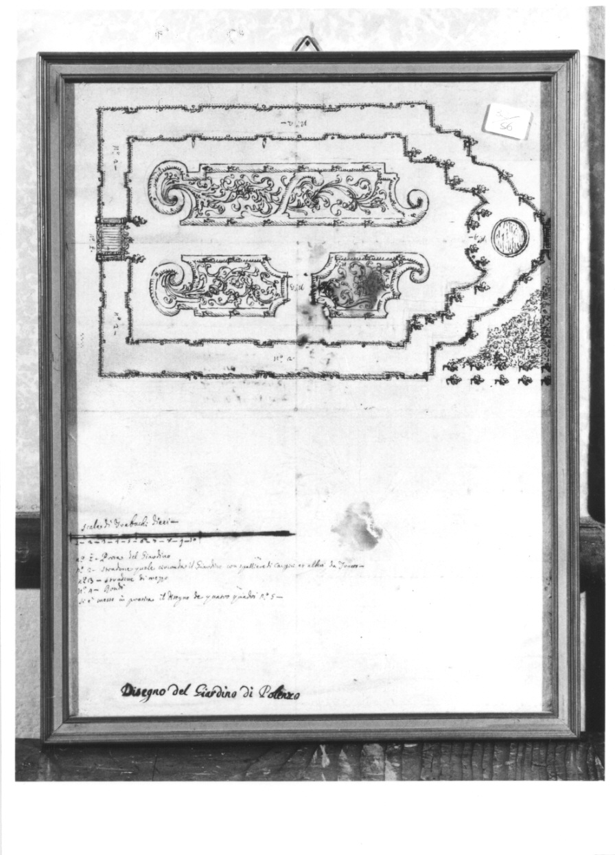 Il disegno è inserito in una cornice in legno verde e oro ed è protetto con una lastra di vetro. Il giardino presenta una doppia aiuola concentrica che racchiude altre tre aiule decorate con tralci. Il giardino è chiuso da un cancello.. Piante. Vegetali. Oggetti: cancello