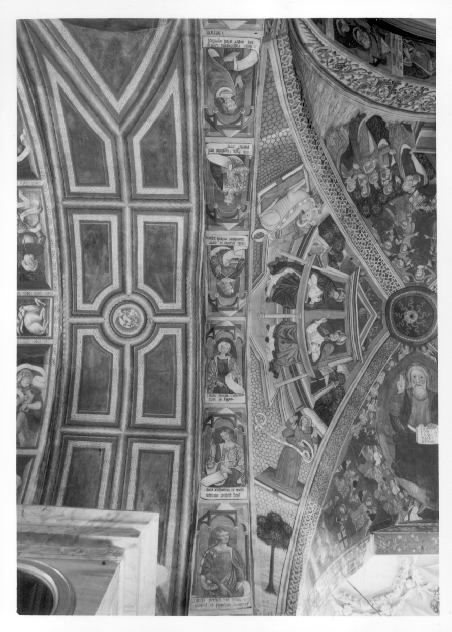 La serie delle Sibille è dipinta sulle due arcate a sesto acuto che separano la volta a crociera del presbiterio dalle volte a botte delle navatelle laterali; la serie dei Profeti si trova invece sull'arcata a sesto acuto che separa il presbiterio dalla navata centrale. Ci sono otto personaggi per ogni arcata, quattro per lato. I riquadri figurativi sono separati tra loro da un bordo bianco che, nell'arcata con i Profeti, è utilizzato per scrivere i nomi dei personaggi. Ogni riquadro ha sullo sfondo la doppia cornice verde e blu, mentre sotto la nicchia rosa e bianca a forma di tiburio esagonale, vi è una doppia arcata verde e blu.