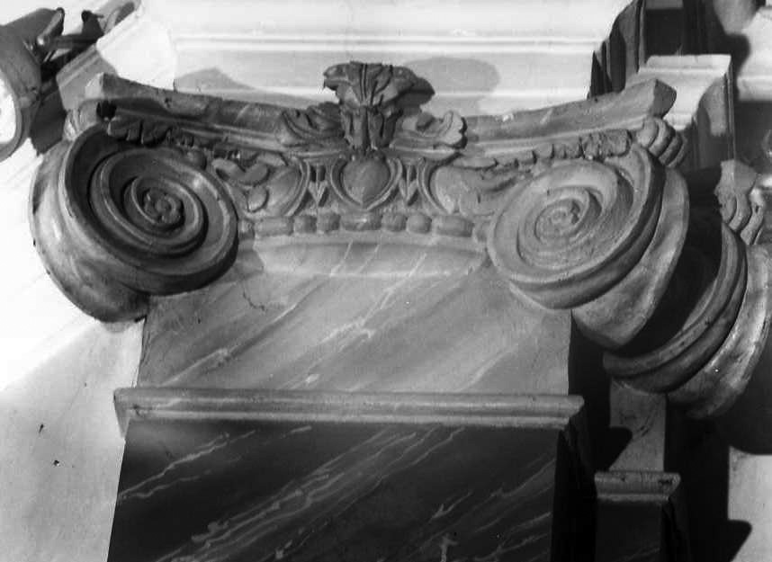 Capitello ionico in stucco marmorizzato con decorazione a grani, foglie e fiori tra le volute, che recano al centro un fiore.