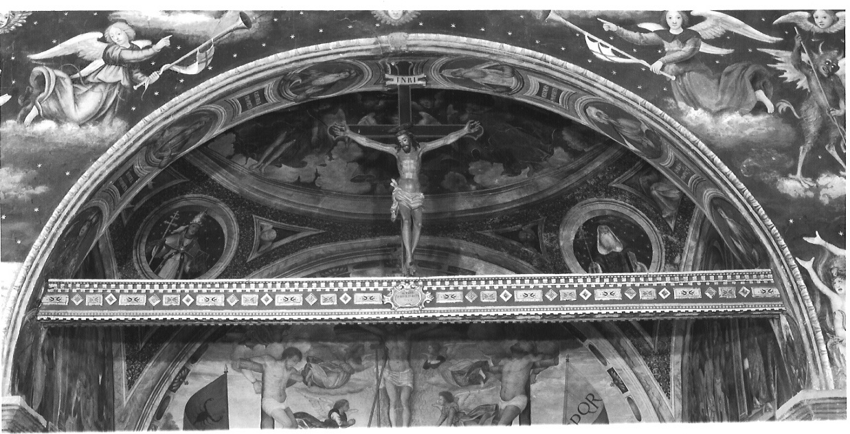 Motivo decorativo a losanghe e rettangoli a rilievo alternati; dipinti in rosso e oro su fondo blu; bordo superiore a dentelli dorati e al centro targa tra volute a rilievo.