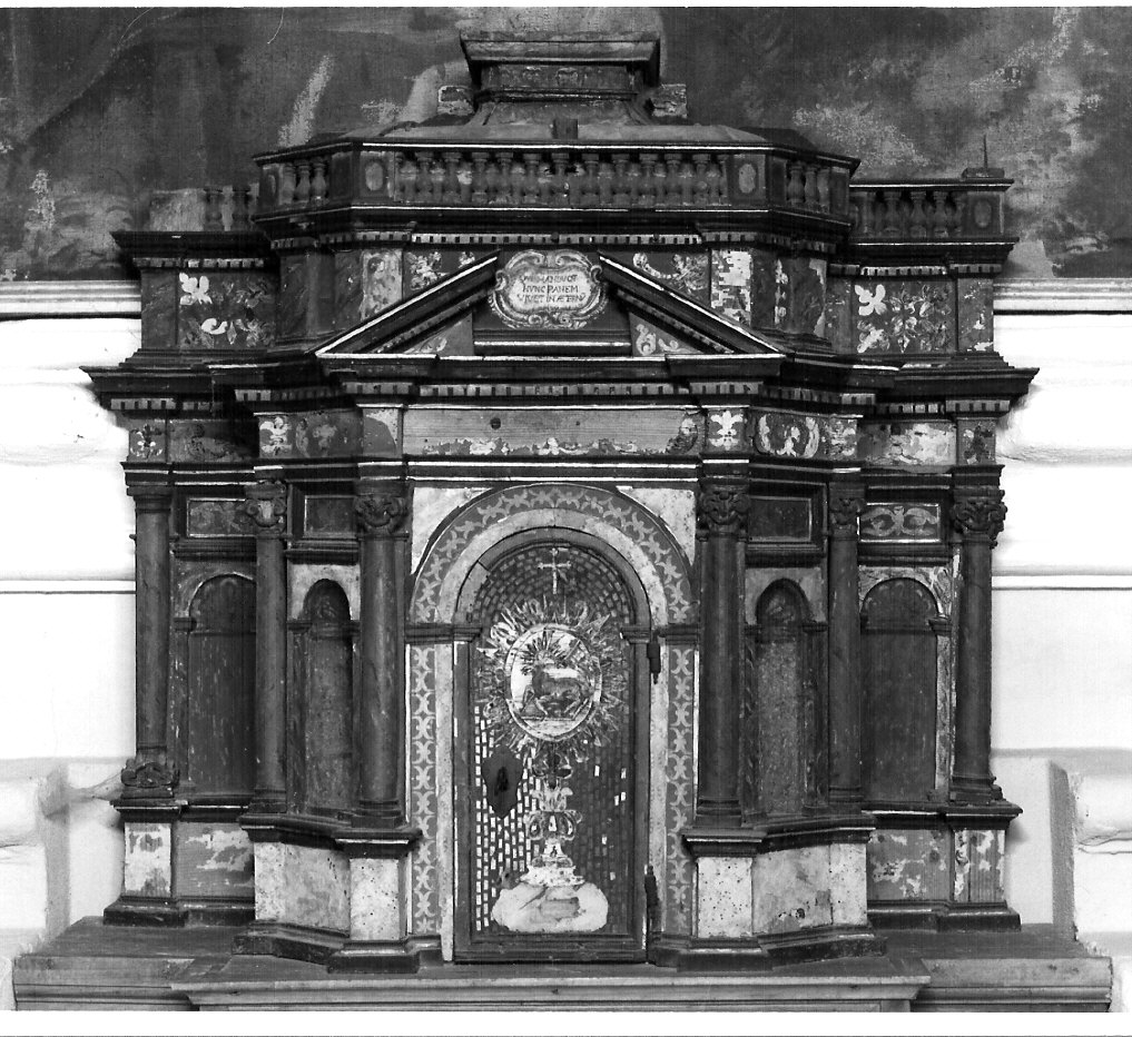 struttura poligonale con prospetto aggettante esagonale, segnato agli angoli da colonne corinzie affiancanti nicchie absidate. Sul lato frontale lo sportello ad arco, delimitato da una cornice dipinta a motivi stilizzati. Fa da raccordo alle colonne un architrave dipinto a grottesche sormontato sul fronte da un timpano spezzato aggettante e delimitato da una cornice a dentelli; tale prospetto è affiancato da due ali delimitate da una colonna corinzia e recanti una nicchia ceca. Fa da copertura una struttura balconata; decorata sul fronte da grottesche e completa di una ringhiera con balaustri a vaso. Simboli: (Agnus Dei) agnello