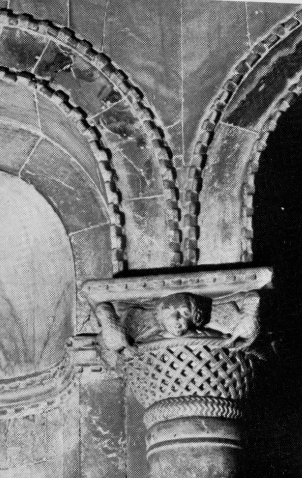 LA ZONA INFERIORE DEL CAPITELLO É TRAFORATA E RIPRODUCE UN NIDO A CESTELLO DI VIMINI INTRECCIATI; DAI QUATTRO ANGELI FUORIESCONO COLOMBE TRA LE QUALI É INSERITA UNA TESTINA D'UOMO.