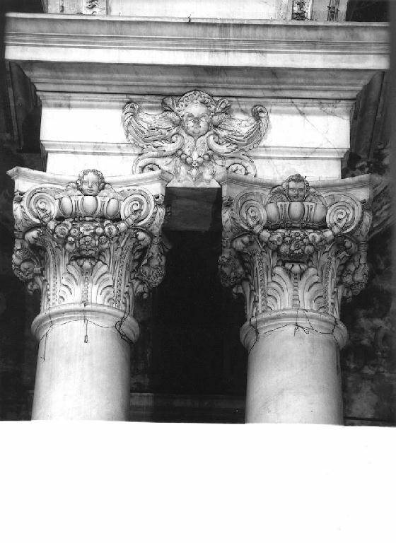 Capitello composito con ghirlande uscenti dalle volute e testine d'angelo al posto del fiore.
