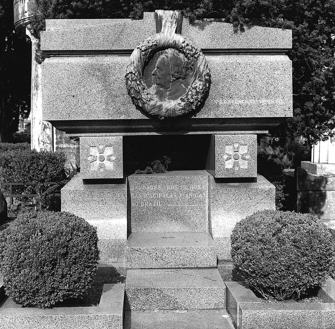 Monumento entro recinto con cespugli laterali e con tre gradini centrali, composto di basamento contenente iscrizioni sul fronte, sostegni per il sarcofago a forma di parellelepipedo posti longitudinalmente con incisioni decorative stilizzate poste sul fronte. Sarcofago recante rilievo sul fronte.