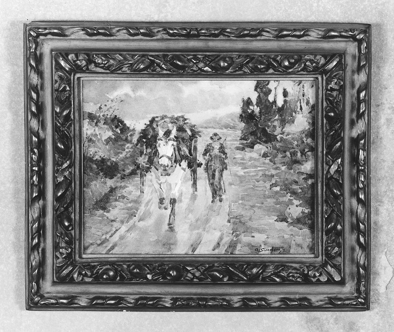 dipinto raffigurante un paesaggio rurale con figura maschile e carro.
