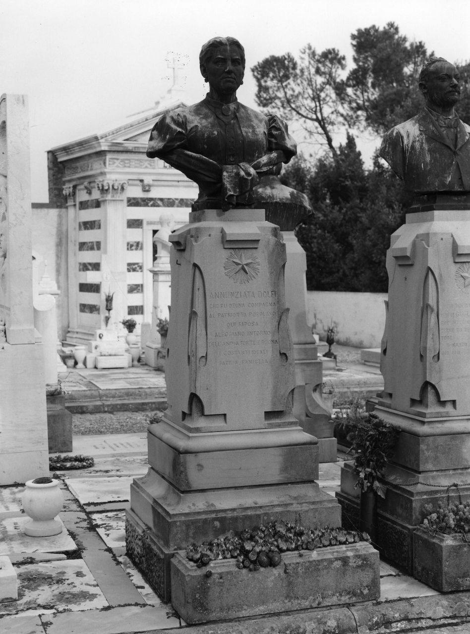 sulla fronte del basamento in pietra l'iscrizione commemorativa e, sopra, una stella raggiante, simbolo massonico, entrambe colorate in oro; sopra il basamento si trova il busto in bronzo. Ritratti: Annunziata Dolfi. Oggetti: medaglia con effige