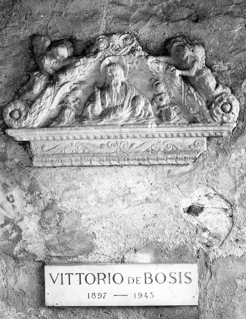 Il rilievo presenta una parte inferiore a cornicione decorato a volute e dentelli; una parte superiore a mezzaluna con figure, ghirlande e rosette.. Personaggi: Dio Padre. Figure: angeli. Attributi: (Dio Padre) globo. Vegetali: ghirlanda