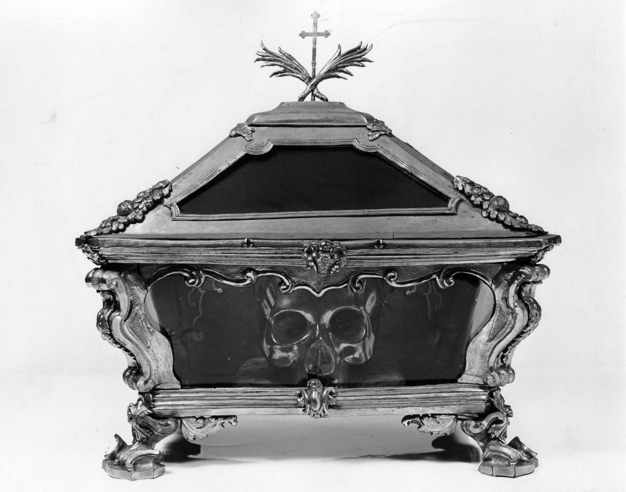 L'interno della cassa, completamente a giorno, contiene un teschio metallico.. Parti anatomiche: teschio