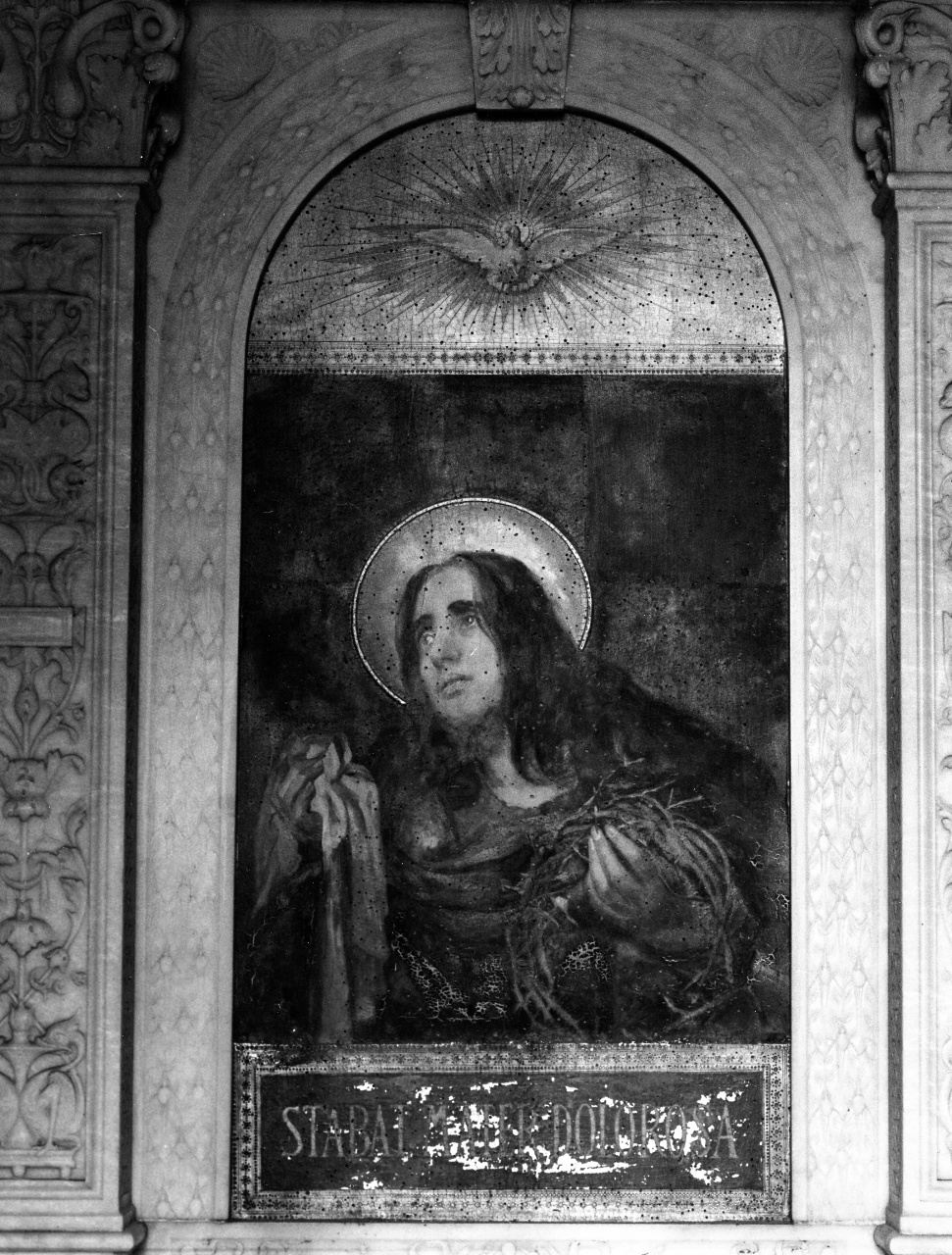 Personaggi: Madonna. Simboli della passione: corona di spine. Oggetti: perizoma. Abbigliamento: all'antica. Simboli: (Spirito Santo) Colomba